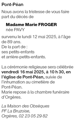 Décédée à Le Theil-de-Bretagne (35240, France) le lundi 12 mai 2025 à l'âge de 89 ans