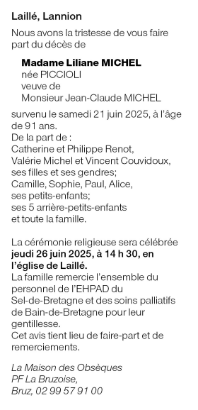 Décédée à Bain-de-Bretagne (35470, France) le samedi 21 juin 2025 à l'âge de 91 ans