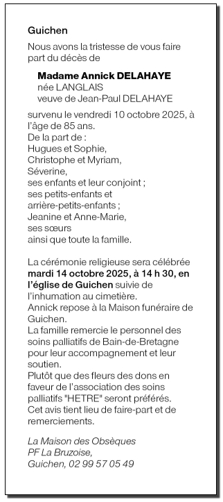 Décédée à Bain-de-Bretagne (35470, France) le vendredi 10 octobre 2025 à l'âge de 85 ans