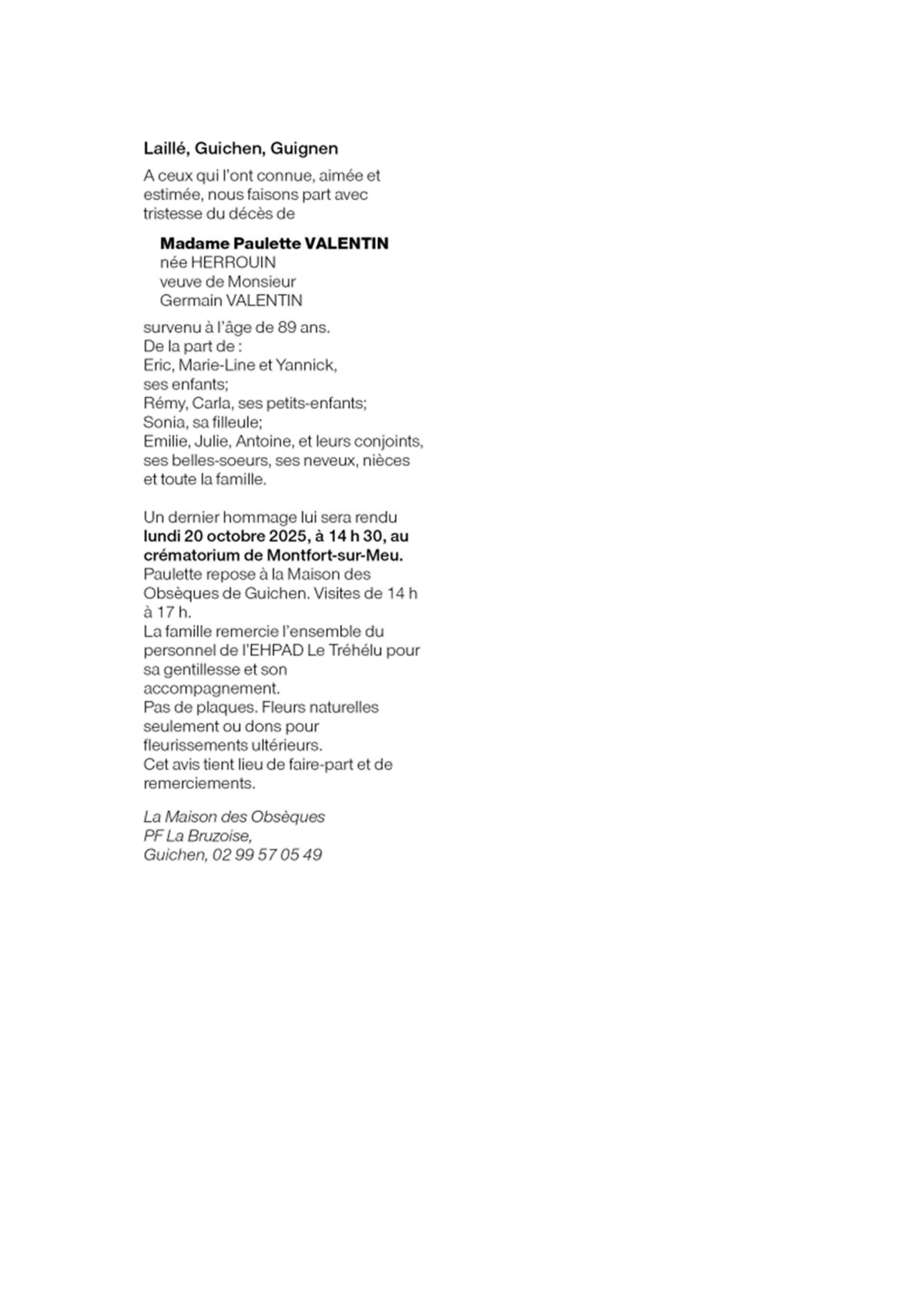 Décédée à Guichen (35580, France) le mercredi 15 octobre 2025 à l'âge de 89 ans