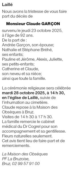Décédé à Pléchâtel (35470, France) le jeudi 23 octobre 2025 à l'âge de 92 ans