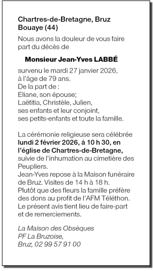 Décédé à Cesson-Sévigné (35510, France) le mardi 27 janvier 2026 à l'âge de 79 ans