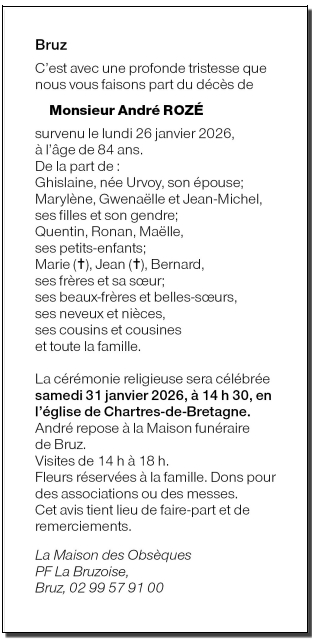 Décédé à Rennes (35700, France) le lundi 26 janvier 2026 à l'âge de 84 ans