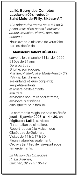 Décédé à Cesson-Sévigné (35510, France) le dimanche 11 janvier 2026 à l'âge de 91 ans