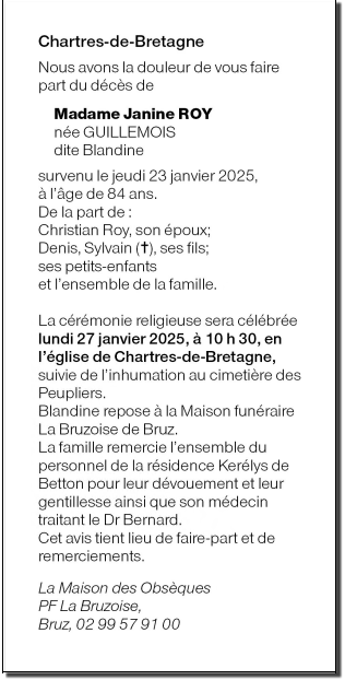 Décédée à Betton (35830, France) le jeudi 23 janvier 2025 à l'âge de 84 ans
