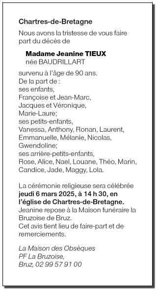Décédée à Chartres-de-Bretagne (35131, France) le samedi 1 mars 2025 à l'âge de 90 ans