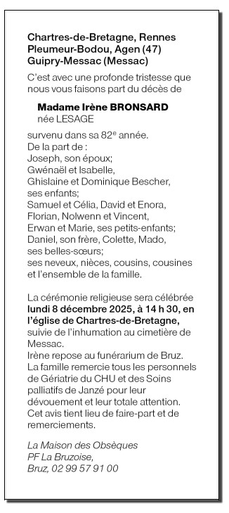 Décédée à Janze (35150, France) le mardi 2 décembre 2025 à l'âge de 82 ans