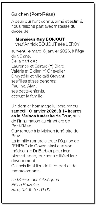 Décédé à Goven (35580, France) le mardi 6 janvier 2026 à l'âge de 95 ans