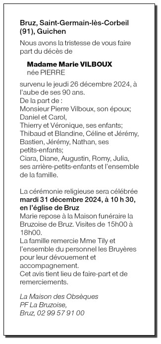 Décédée à Bruz (35170, France) le jeudi 26 décembre 2024 à l'âge de 89 ans