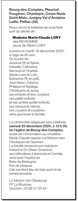 Décédée à Bain-de-Bretagne (35470, France) le mardi 16 décembre 2025 à l'âge de 85 ans