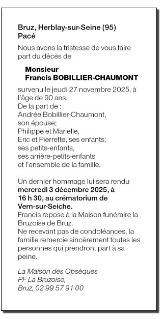 Décédé à Bruz (35170, France) le jeudi 27 novembre 2025 à l'âge de 90 ans